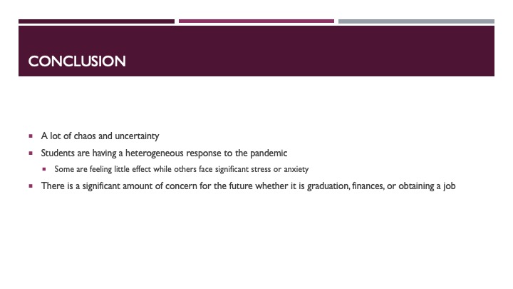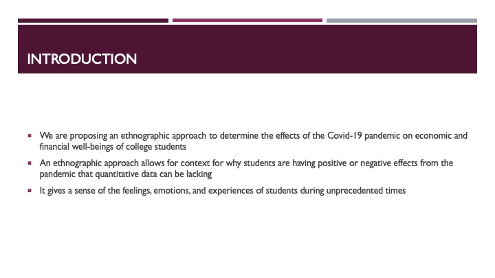 In this podcast, we will be discussing our ethnographic approach to measuring the economic and financial impacts from the Covid-19 pandemic on college students at The Ohio State University. We highlight what previous research has found and present our findings from an ethnographic survey and auto-ethnographic essay, where we express the feelings, emotions, and experiences of students during these unprecedented times.